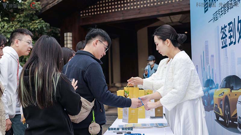 活动选址于兼具自然景观与高端商务氛围的红杉谷酒店,旨在营造“科技与自然共生”的沉浸式体验环境。从签到处起,深蓝与华为乾崑联名的视觉元素便贯穿始终,嘉宾在完成签到的同时,即可领取一份定制有机茶油礼盒,以精致心意开启一场关于未来出行的探索之旅。
