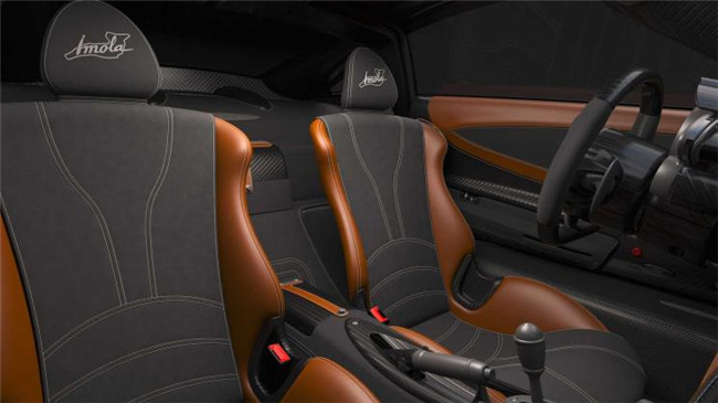 内饰方面,Huayra Imola依然保留了帕加尼一直延续着机械感十足的风格,挡把下方裸露的挡杆传动机构,粗暴的碳纤维纹路,棕色皮质、木材与Alcantara材质相辅相成,突显出独特之美。另外,简单直接的机械式仪表盘、平底式碳纤维多功能方向盘、Sparco代工的四点式赛车安全带等在新车上也有配备,此外新车还在头枕处绣有“Imola”标识。