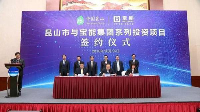 10月16日,宝能集团与苏州省昆山市人民政府在签署系列投资合作协议,根据协议,双方将在开展新能源汽车、青阳港城市综合体、夏驾河宝能科技园、综合医养、周庄文旅等项目合作,并在汽车电商销售领域建立战略合作关系。