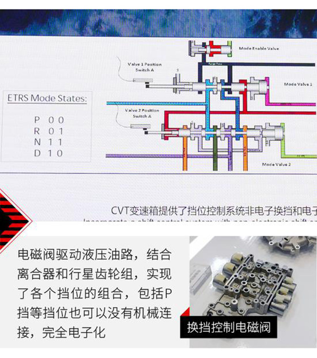 通过电磁阀和油路,新CVT变速箱可以实现电子选挡,这样匹配电子挡把乃至按钮、旋钮换挡都不是问题;当然考虑到一些定位相对低一些的车型,它也可以适配传统的机电式挡把。