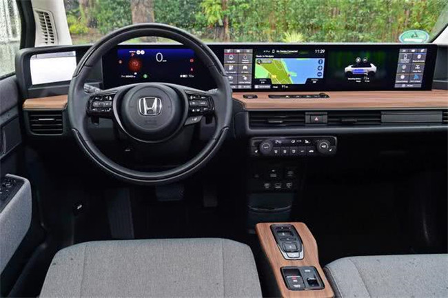 惊喜从拉开车门的那一霎开始,为了降低风阻,本田e采用了类似于阿斯顿-马丁的隐藏式门把手,上车因此变得颇具仪式感。木纹装饰面板贯穿整个仪表台,几乎与车身等宽的仪表板由多块液晶屏相接而成。驾驶席前方是一块8.8英寸液晶屏,右侧则是用于信息娱乐系统的两块12.3英寸“平板电脑”。