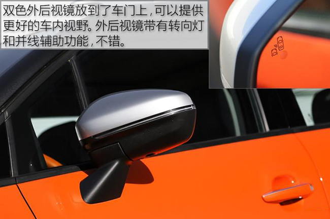 无论车头还是侧面,都能看到非常丰富的细节,设计师不愿意放弃任何一个可以发挥的空间,这是典型的精品小车设计思路,因为要讨年轻人欢心,要保持新鲜感,很难做减法。而丰富的颜色搭配也是必备的,除了车身主色调之外,车身底部还使用了黑色护板做帮衬,再加上双色外后视镜以及银色车顶行李架,这台车具有足够的张力。这种多颜色车身的形式在很多小车上都有使用,可见其对视觉效果的贡献。
