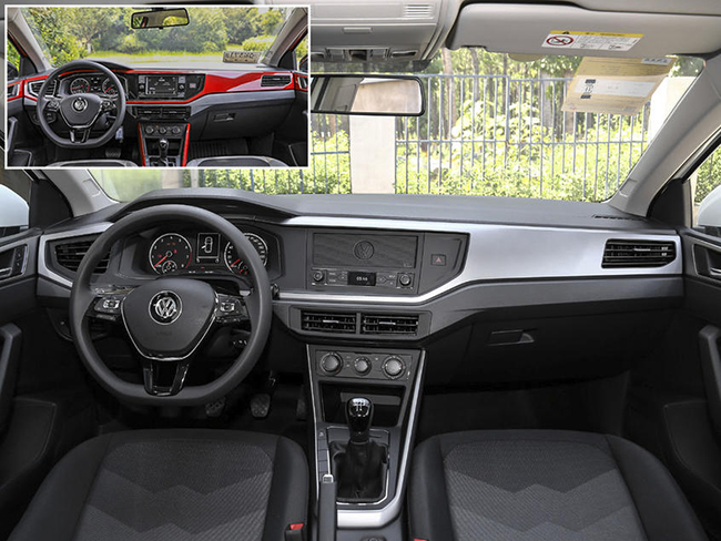 Polo的内饰采用了MQB家族化设计风格,中控台向驾驶员一侧倾斜以提高操作便利性。中控台没有屏幕看着有些突兀,这一点真的很“原汁原味”。顶配和次顶配车型采用了与车身同色饰板,内饰更具活力。