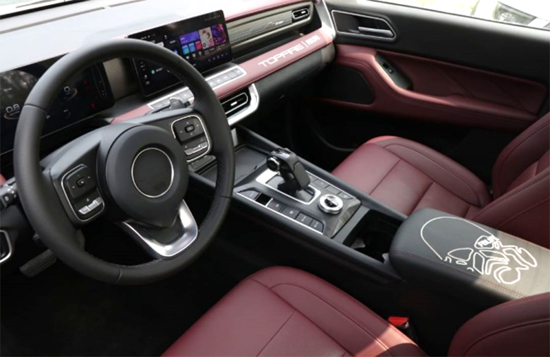 顶火与越野e族联名的内饰与车贴铸下设计师的印记和使用者的血统。头枕、肘枕配备"面具武士造型+FBLIFE字标"刺绣,仪表板右装饰件增加“TOPFIRE | FBLIFE"刺绣。车门两侧及后尾门增加限定版专属 “面具武士造型+FBLIFE”车贴,体现身份的尊贵。
